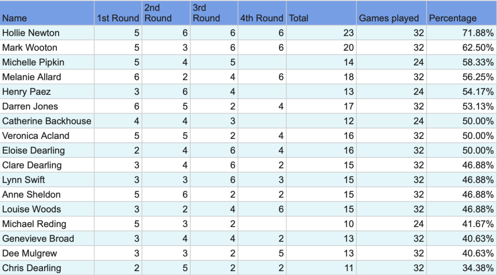 The competition was fierce, with several players narrowly missing out. Special recognition goes to Melanie Allard (18 points), Darren Jones (17 points), and Veronica Acland (16 points), who fought valiantly and kept the race exciting until the very end. Qualification was only a couple of games away β maybe next time?